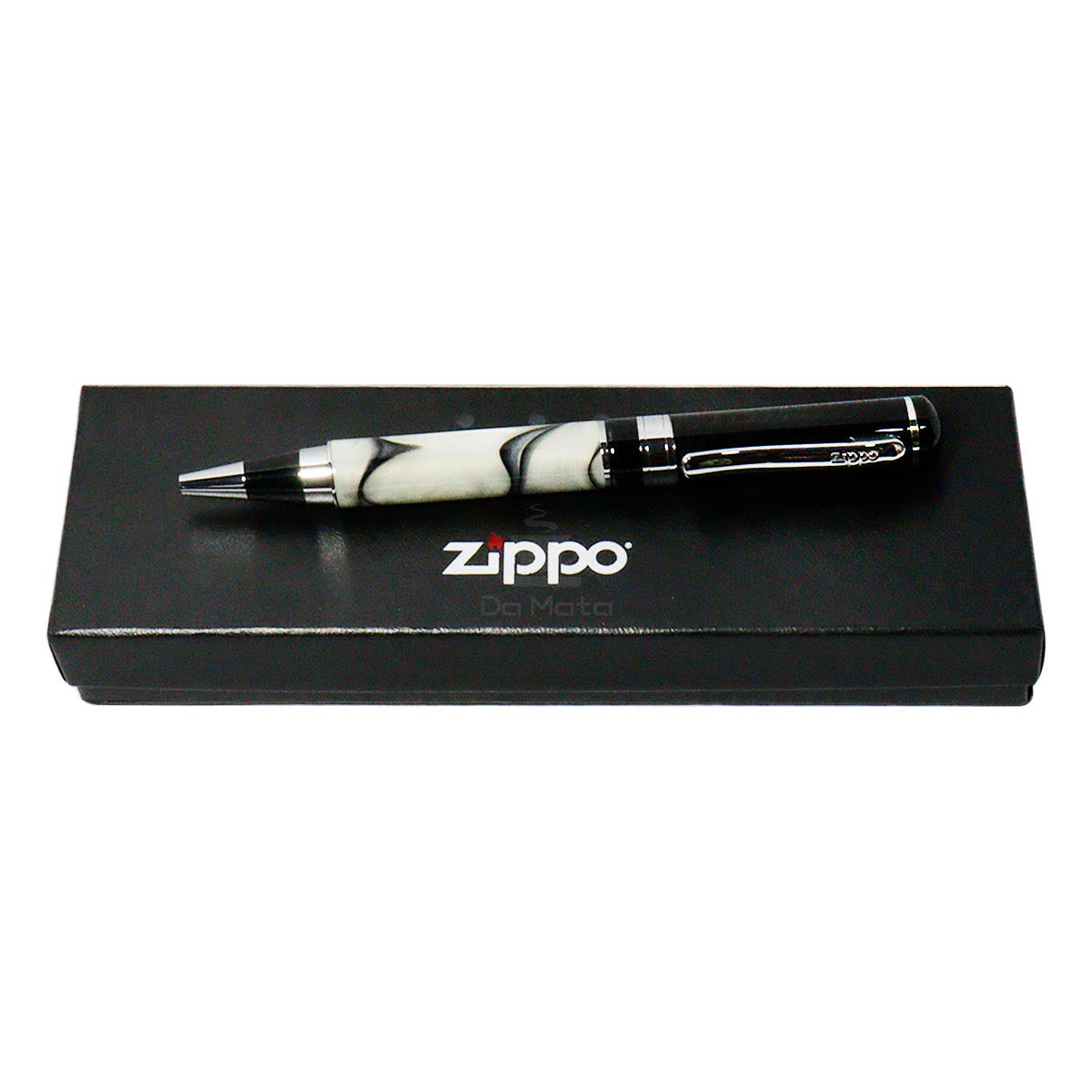 Caneta esferográfica Zippo Oyster com acabamento preto e detalhes cromados, com a parte inferior marmorizada,com designer inovador, nome Zippo no prendedor, estilosa e pesada. Para abrir e usa-la é necessário girar a caneta.