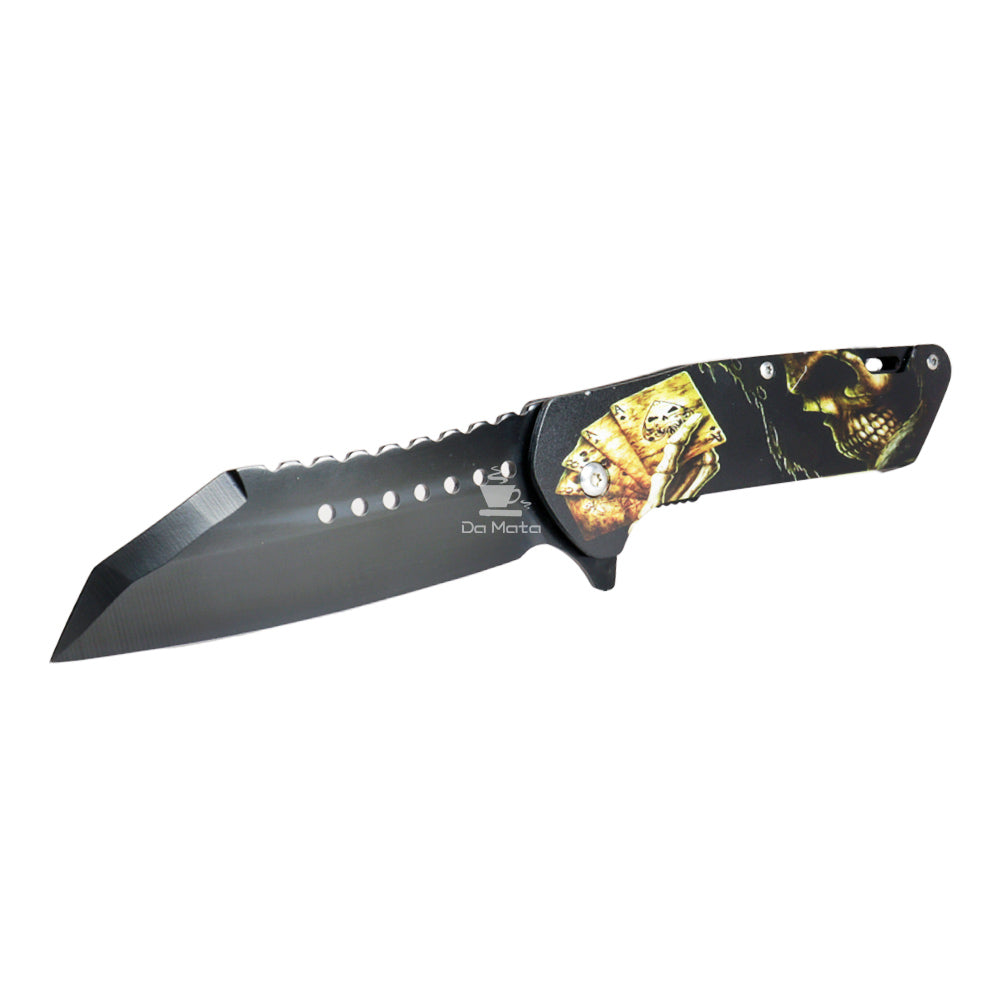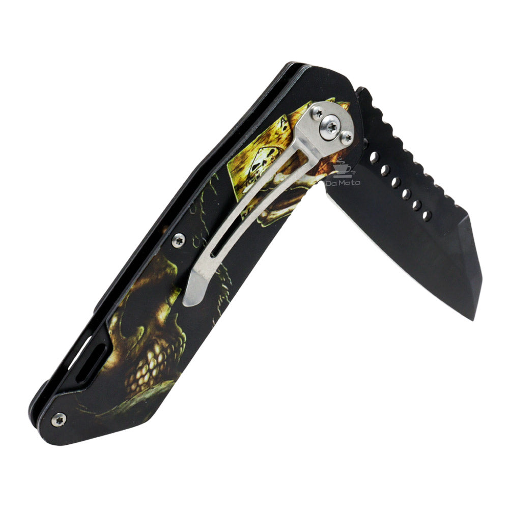 A lâmina afiada é adornada com detalhes que evocam a majestade de um Skull, tornando cada corte não apenas um ato de precisão, mas também uma expressão de poder e elegância. O mecanismo de trava de segurança é meticulosamente projetado para oferecer uma experiência de uso segura e confiável, permitindo que você desfrute da funcionalidade excepcional do canivete sem preocupações.