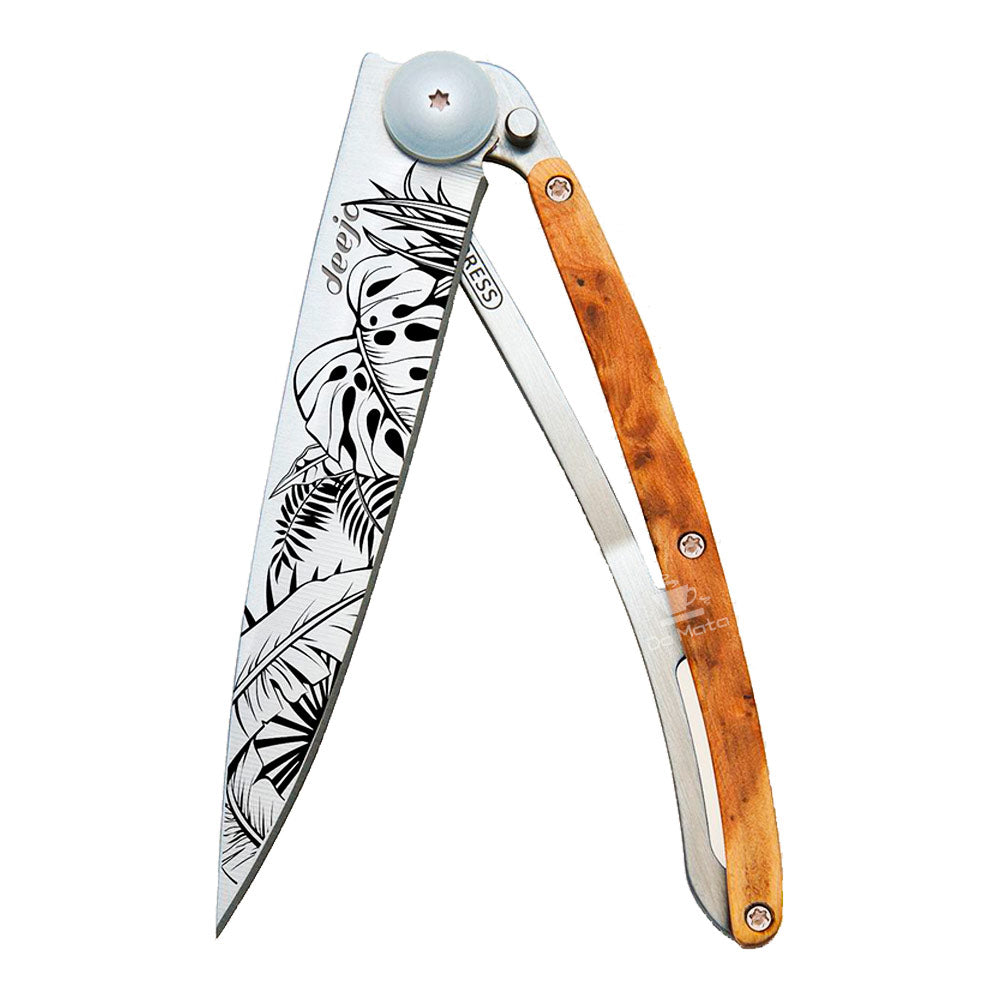 O cabo do canivete, feito de madeira de junípero autêntica, não apenas oferece uma sensação tátil agradável, mas também adiciona um toque de autenticidade e charme. A rica história dos canivetes Deejo, que combina tradição com inovação, empresta uma profundidade de significado a essa ferramenta excecional, que vai além de sua função básica. E não deixe de explorar também o modelo Latino Skull para mais opções surpreendentes.